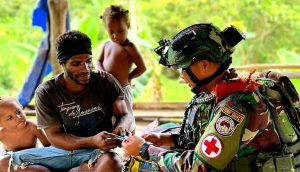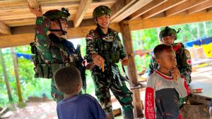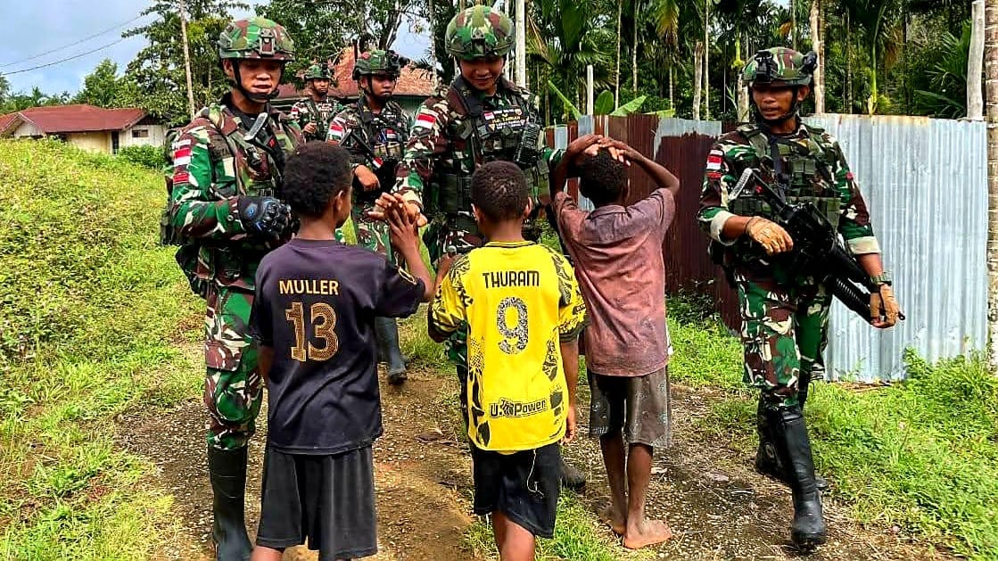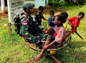 “Senang sekali bisa main dengan kakak-kakak tentara. Dapat hadiah juga,” ujar Kristin Wambarop, salah satu anak setempat dengan senyum tersipu malu.