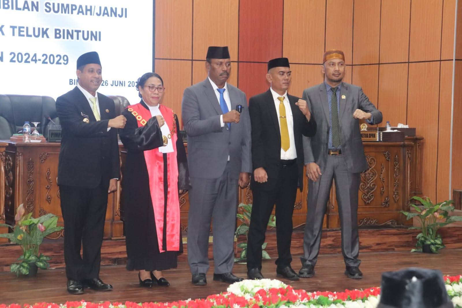 TELUK BINTUNI – Dewan Perwakilan Rakyat Kabupaten (DPRK) Teluk Bintuni, Provinsi Papua Barat, menggelar Rapat Paripurna Peresmian dan Pengambilan Sumpah Janji Wakil Ketua I DPRK Masa Jabatan 2024-2029, di Aula Sidang Sekretariat DPRK, Jalan Raya Bintuni KM 6, Kamis (26/6).