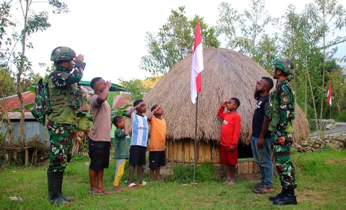 Masyarakat Papua bersama prajurit Satgas Yonif – 521/DY merayakan Hari Ulang Tahun ke-80 Kemerdekaan Republik Indonesia dengan penuh semangat Nasionalisme dan kebanggaan.