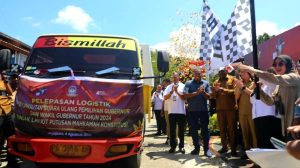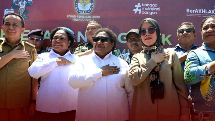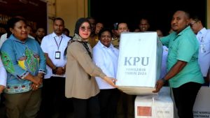 Seremoni pelepasan logistik dihadiri langsung Wakil Menteri Dalam Negeri Dr. Ribka Haluk, S.Sos., MM., Anggota KPU – RI Iffa Rosita, SE., MM., Pj. Gubernur Papua Dr. Agus Fatoni serta unsur Forkopimda Papua maupun Kota Jayapura dan dipimpin oleh Ketua KPU Provinsi Papua, Diana Dorthea Simbiak, S.Sos.