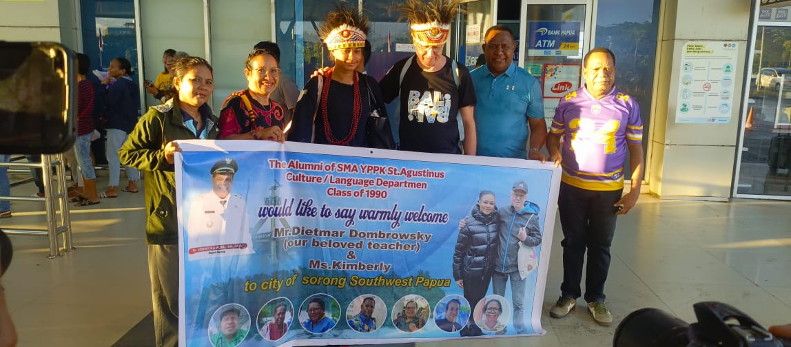 KOTA SORONG- Tangis haru dan tawa penuh nostalgia menyatu di pelataran Bandara DEO Sorong, Jumat Pagi (08/08/25), saat sosok yang telah meninggalkan jejak panjang dalam dunia pendidikan Papua Barat kembali menjejakkan kaki di Tanah Malamoi. Ia adalah Mr. Dietmar Dombrowsky, sosok guru yang dikenal bukan sekadar pengajar, tapi panutan dengan kharisma luar biasa di masanya. Bersama Ms. Kimberly, ia disambut hangat oleh alumni SMA YPPK St. Agustinus, Departemen Bahasa & Budaya Angkatan 1990, yang datang khusus untuk menyambutnya.