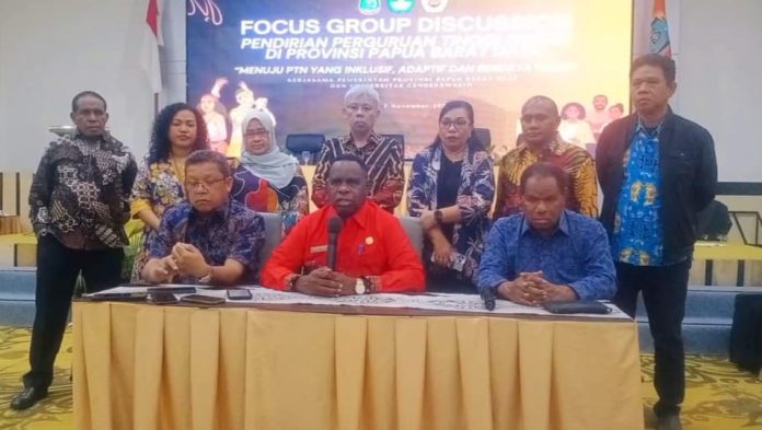 Pemerintah Provinsi Papua Barat Daya melalui Dinas Pendidikan bekerja sama dengan Universitas Cenderawasih (Uncen) menggelar Focus Group Discussion (FGD) bertajuk “Menuju Perguruan Tinggi Negeri yang Inklusif, Adaptif, dan Berdaya Saing” di Vega Prime Hotel, Kota Sorong, Jumat (7/11/2025).