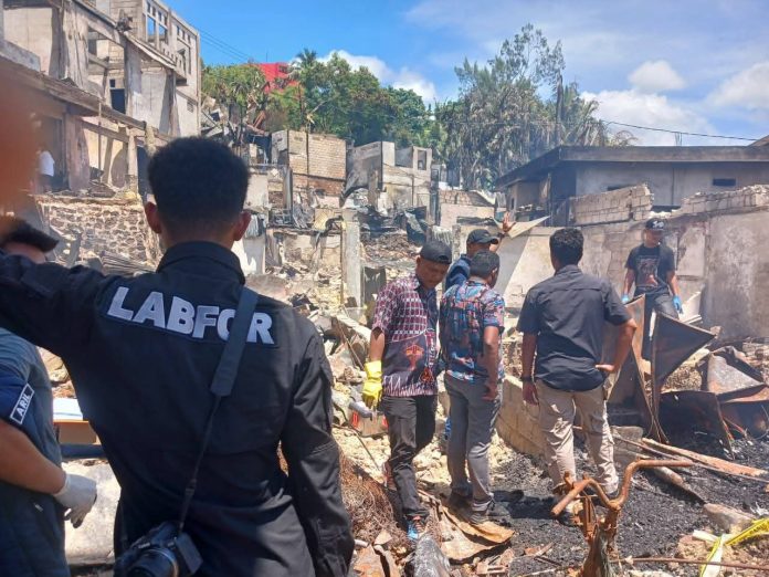 JAYAPURA – Satuan Reserse Kriminal Polresta Jayapura Kota bersama Tim Laboratorium Forensik (Labfor) Polda Papua serta Unit INAFIS melaksanakan olah tempat kejadian perkara (TKP) lanjutan terkait kebakaran yang menghanguskan 26 unit rumah di Kompleks Palopo, Kelurahan Mandala, Distrik Jayapura Utara, Papua.