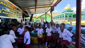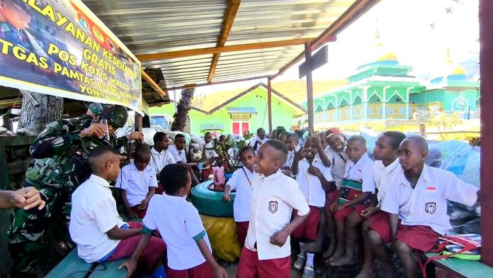 JAYAWIJAYA – Keceriaan warga tampak di Pos Kotis Satgas Yonif – 521/DY, Distrik Walesi, Kabupaten Jayawijaya, saat prajurit TNI Angkatan Darat membuka layanan “Barbershop Macan Kumbang Gratis”, Rabu (17/09/2025).
