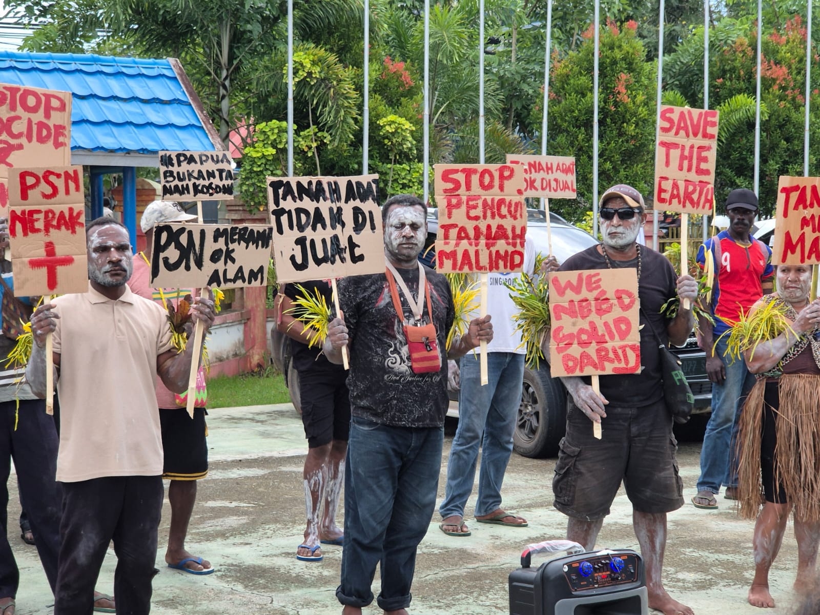 Juru bicara Solidaritas Merauke, Simon Petrus Balagaize menjelaskan wilayah adat Merauke seluas sekitar 2.128.554 hektare ditetapkan oleh Pemerintah Indonesia sebagai target pengembangan industri pangan dan energi melalui PSN seluas meliputi perkebunan kelapa sawit, tanaman pangan, dan peternakan.